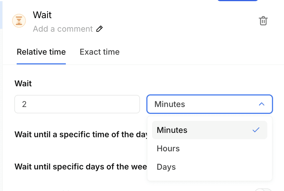 ضمن إعدادات مكون تأخير الوقت، يمكنك اختيار التأخير حتى وقت معين من اليوم. إذا كان لديك رسالة تلي هذا التأخير، فسيتم تحديد وقت إرسال تلك الرسالة.