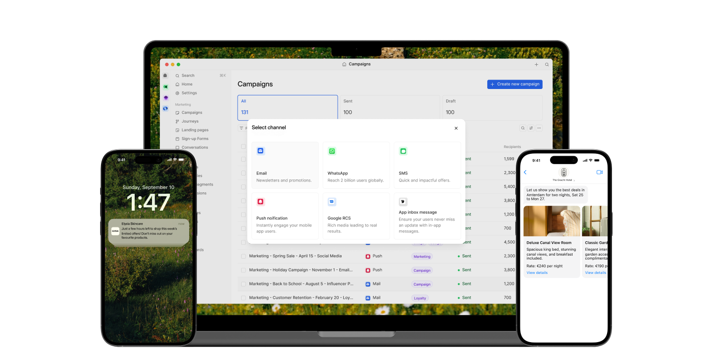Reach customers everywhere. Email, SMS, WhatsApp, RCS, push notifications, and voice — all from a single platform. One API, one inbox, one analytics dashboard.